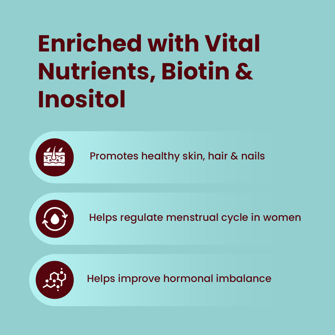 Contains multiple Vitamins such as Vit A, B6, B12, C, E for overall support for health of women's hair, nail and skin.