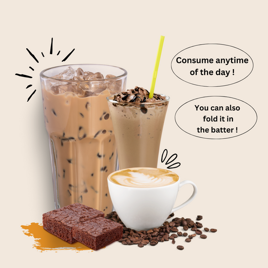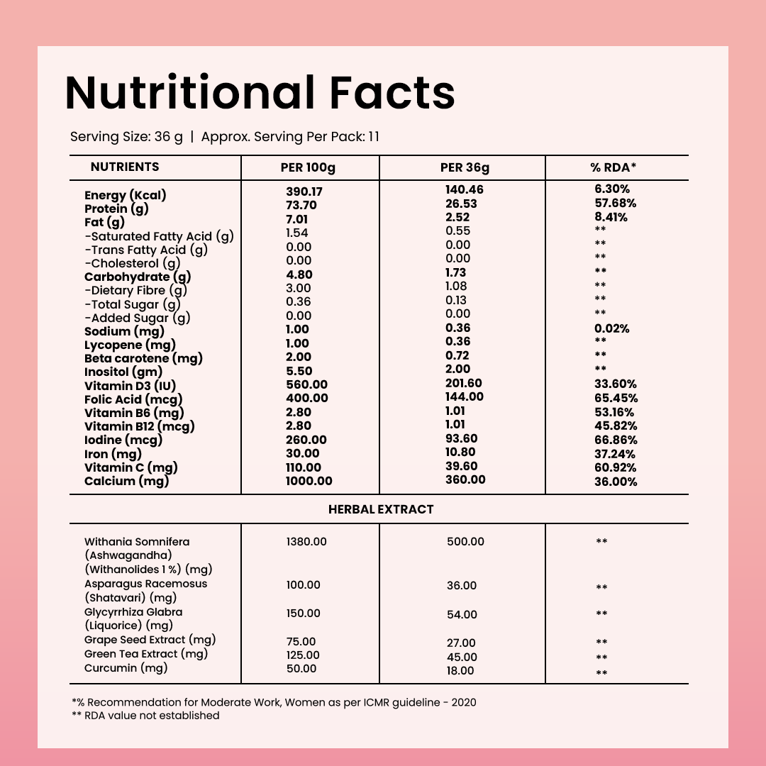 Pisum Sativum L. (Pea Protein Isolate) 80%, Oryza Sativa L.(Brown Rice Protein) 80%, Inositol, Natural Identical Flavor (Mocha & Coffee), Coffee Extract, Tricalcium Phosphate, Sweetener (INS 960), Glycyrrhiza Glabra L. (Liquorice), Green Tea Extract, Vitamin C, Withania Somnifera (Ashwagandha), Asparagus Racemosus (Shatavari), Grape Seed Extract, Curcumin, Iron, Vitamin B6, Carotenoids, Lycopene, Folic Acid, Potassium Iodide, Vitamin D3 and Vitamin B12.