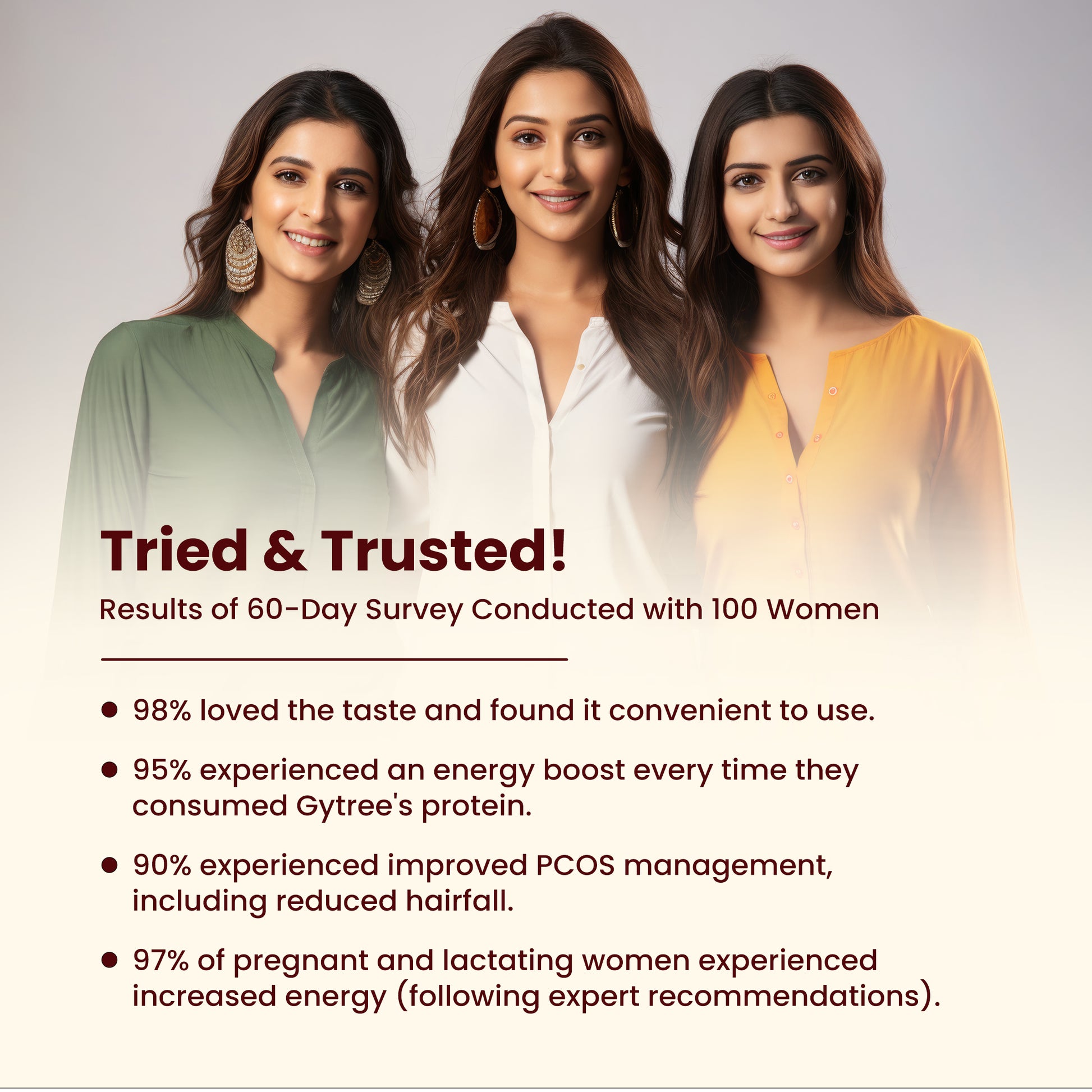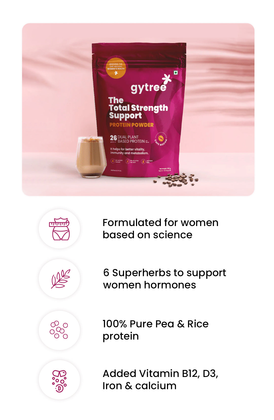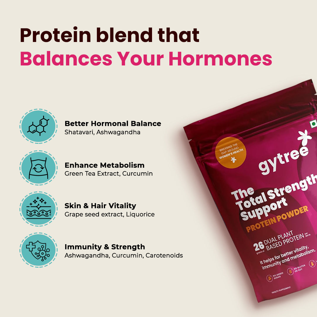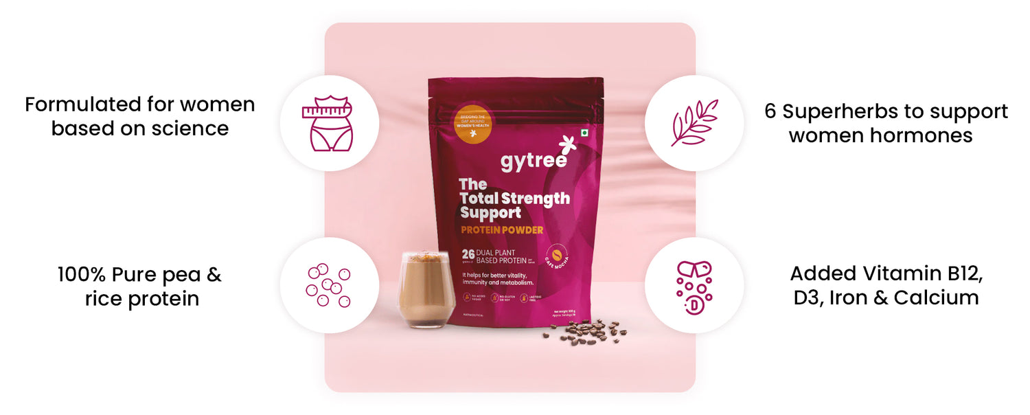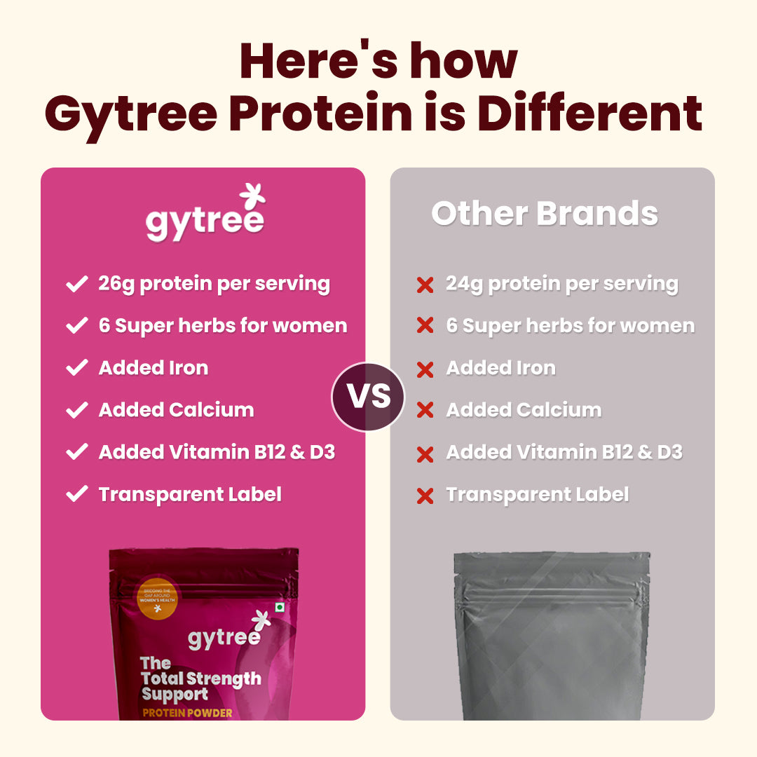 Most protein powders in India are made for men, tested on men, and marketed to men. Women, however, need a protein powder that gives no bloating, helps balance hormones, manages weight, and reduces hair fall while providing skin glow. Gytree's protein is designed specifically for women, containing iron, calcium, and vitamin D3 that address common deficiencies. It is made from plant protein extracts of Canadian golden pea and brown rice, which do not cause bloating and provide all nine essential amino acids to boost energy. Additionally, it is infused with super herbs and adaptogens such as ashwagandha, shatavari, curcumin, etc., to help balance hormones.