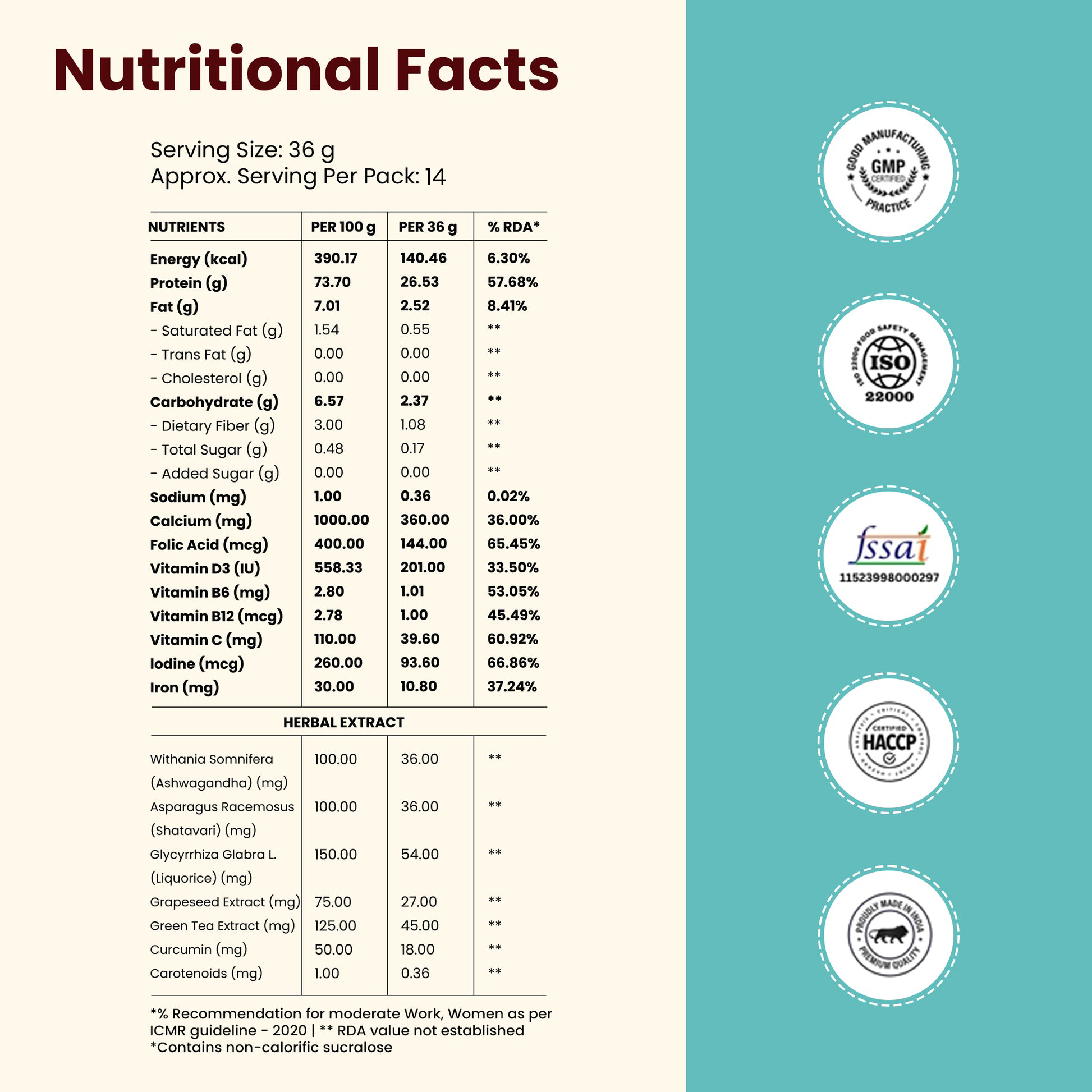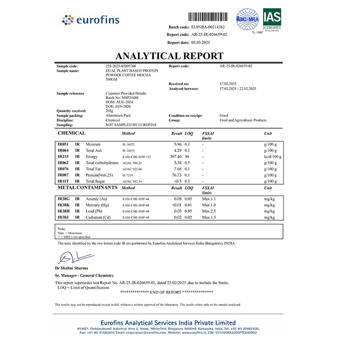 Pisum Sativum l.(Pea Protein Isolate) 80%, Oryza Sativa L. (Brown Rice Protein) 80%, Natural Identical Flavour (Mocha & Coffee), Coffee Extract, Tricalcium Phosphate, Glycytthiza Glare L. (Liquorice), Green Tea Extract, Vitamin C, Artificial Sweetener (INS955), Withania Somnifera (Ashwagandha), Asparagus Racemosus (Shatavari), Grapeseed Extract, Curcumin, Iron, Carotenoids, Folic Acid, Potassium Iodide, Vitamin D3 & Vitamin B12.