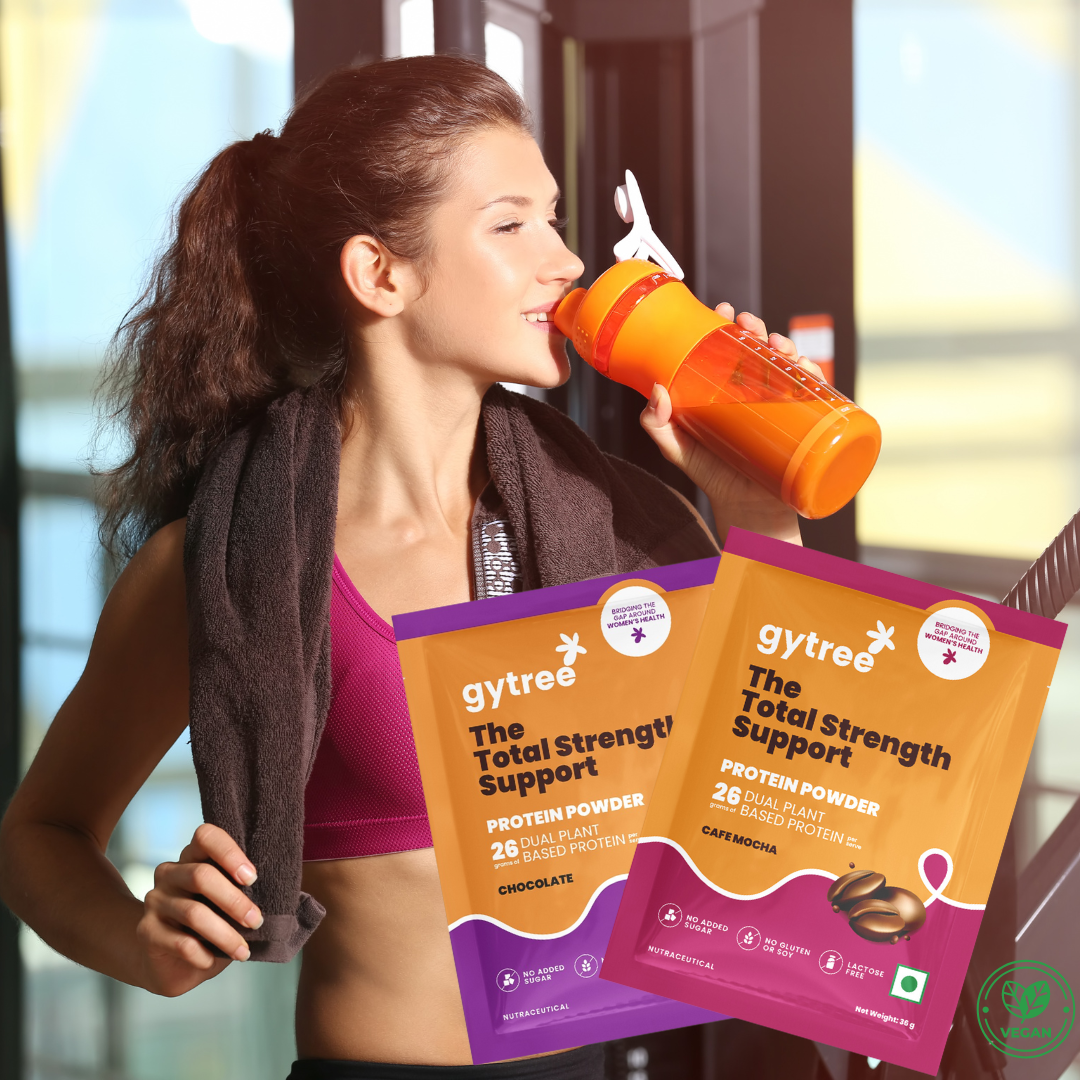 Most protein powders in India are made for men, tested on men, and marketed to men. Women, however, need a protein powder that gives no bloating, helps balance hormones, manages weight, and reduces hair fall while providing skin glow. Gytree's protein is designed specifically for women, containing iron, calcium, and vitamin D3 that address common deficiencies. It is made from plant protein extracts of Canadian golden pea and brown rice, which do not cause bloating and provide all nine essential amino acids to boost energy. Additionally, it is infused with super herbs and adaptogens such as ashwagandha, shatavari, curcumin, etc., to help balance hormones.