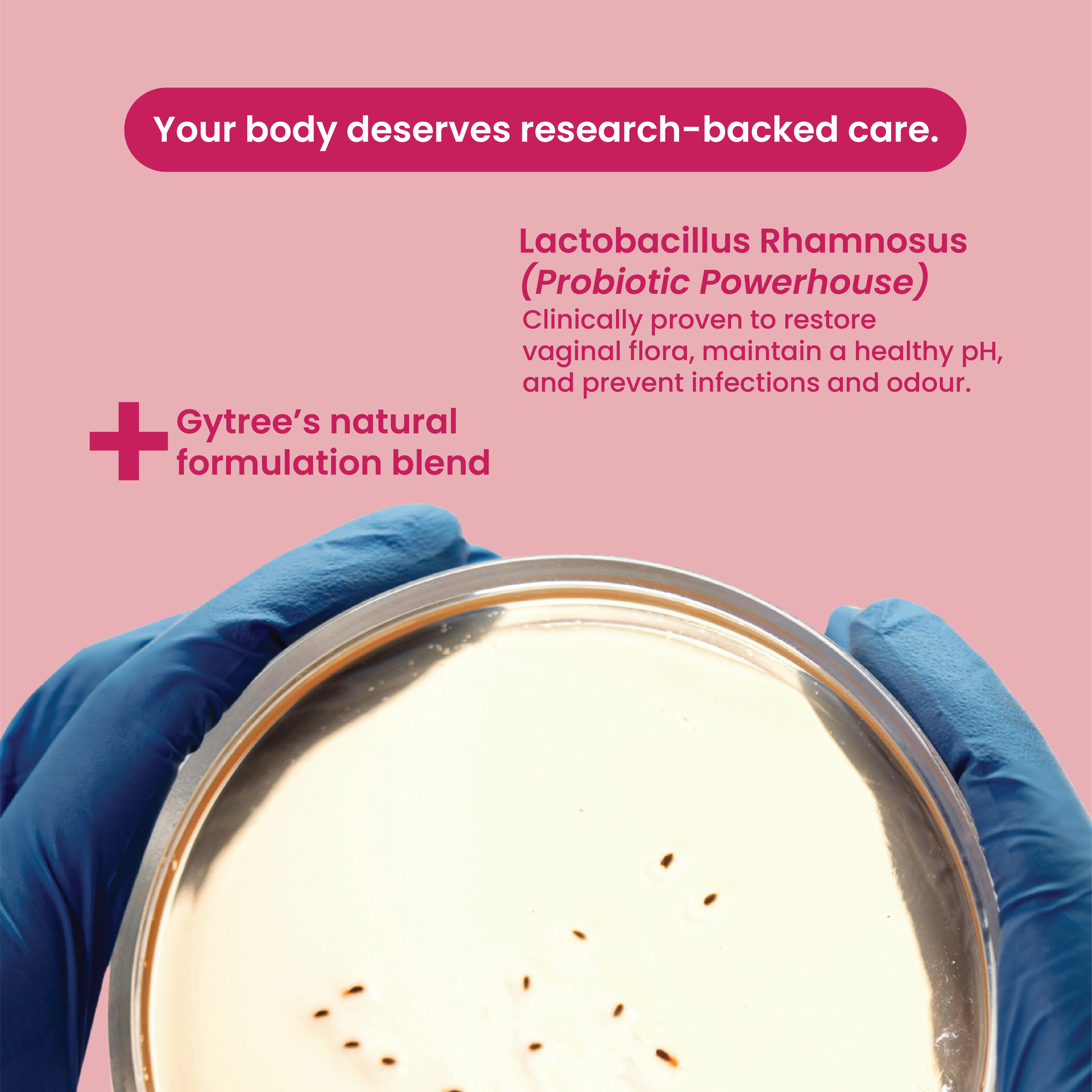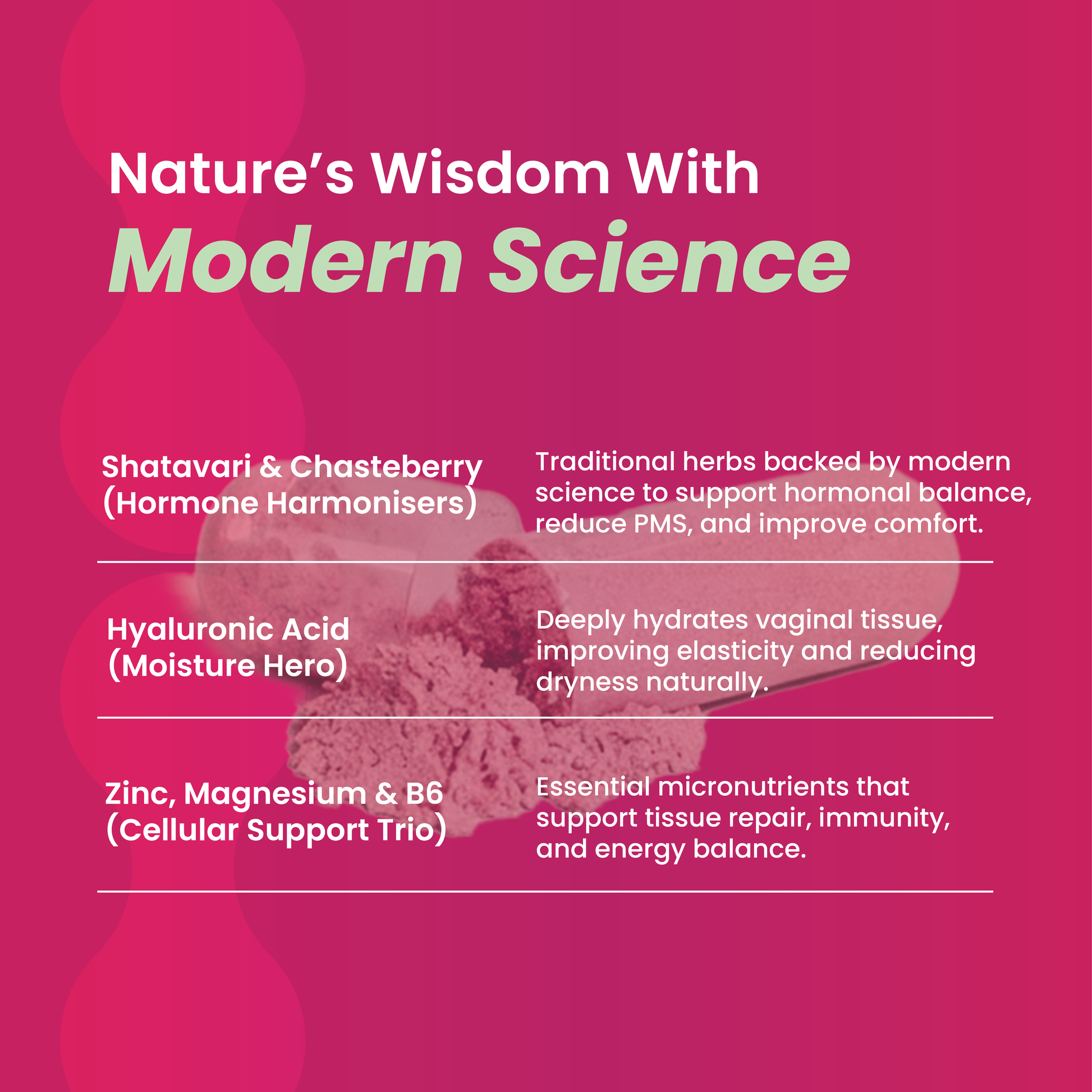 It combines probiotics (Lactobacillus rhamnosus) with botanical extracts like Fenugreek, and Chasteberry to rebalance your internal microbiome, improve vaginal hydration and moisture, and support hormone health.